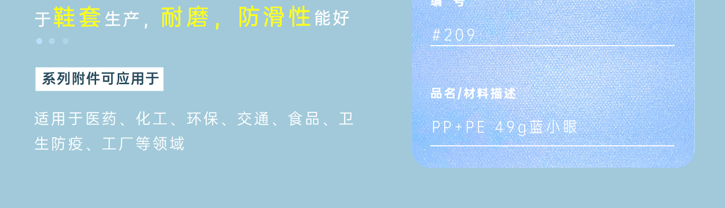 主要成分:PP+PE 克重:49g 顏色:藍色 產(chǎn)品用途:適用于醫(yī)藥、化工、環(huán)保、交通、食品、衛(wèi)生防疫、工廠等領域
