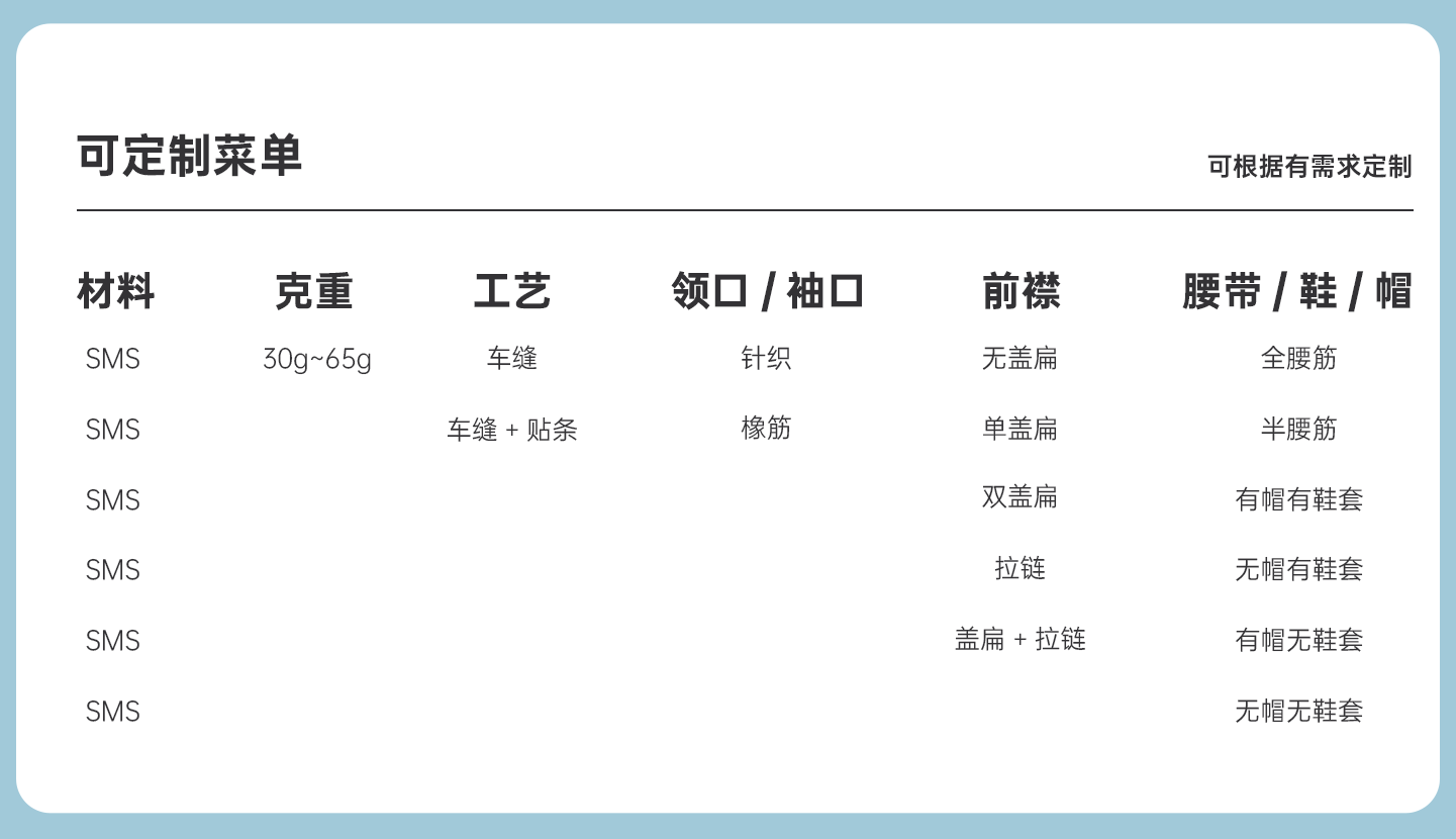 規(guī)格尺寸:S~2XL 主要成分:聚丙烯+聚乙烯 克重:28g-50g 顏色:白色、黃色、藍色 工藝:車縫、針織袖口領口魔術貼、呵腰帶 包裝:10件/包 10包/箱